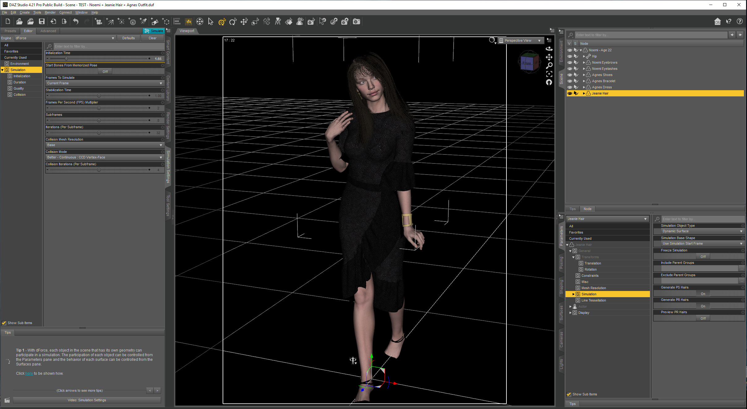 The hair's still not up to snuff, though:  hair with simulation settings that simply doesn't respond to simulation;  hair that clips into the figure unless you use the wind and posing morphs to the point that it looks like the character is in a wind tunnel.   But those issues certainly don't point to the DAZ Studio software.