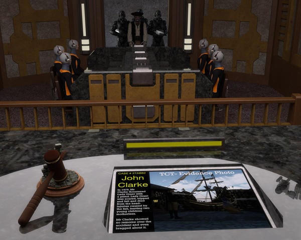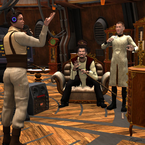 To protect the health of its citizens the shining city of New Olympia recently created a germ-free environment, using advanced technologies afforded by the BioCleanse Corporation. All visitors are required to undergo a BioCleanse procedure before entering the city. The procedure is harmless to human life, destroying only pathogenic bacteria, viruses and parasites, or so explains the BioCleanse attendant (the old guy in the white jacket in the back.) He has his hands full with the arrival of the Anachronist Society for their annual soiree. (That is Reggie Boland, descendant of Sir Mandrake Boland, the original Mr Poofy Pants, wearing attire similar to his forebearer.)