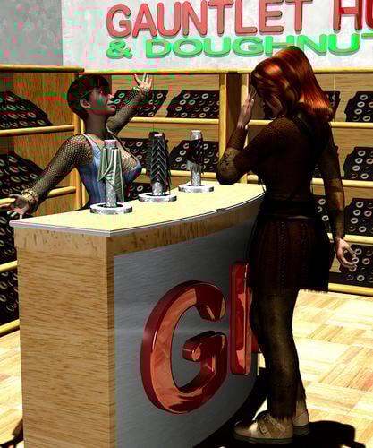 "Welcome to Gauntlet Hut, where you can get the latest gauntlets and the best doughnuts! I'm sorry, those are only display models; we're actually all out of gauntlets at the moment. But we've got some really fresh doughnuts!"