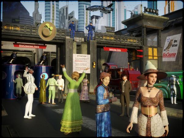 To protect the health of its citizens the shining city of New Olympia recently created a germ-free environment, using advanced technologies afforded by the BioCleanse Corporation. All visitors are required to undergo a BioCleanse procedure before entering the city. The procedure is harmless to human life, destroying only pathogenic bacteria, viruses and parasites, or so explains the BioCleanse attendant (the old guy in the white jacket in the back.) He has his hands full with the arrival of the Anachronist Society for their annual soiree. (That is Reggie Boland, descendant of Sir Mandrake Boland, the original Mr Poofy Pants, wearing attire similar to his forebearer.)
