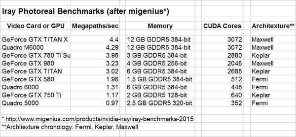 So anyway, perhaps this might help sort some of the confusion out. I have taken the benchmark results that Mec4D linked to and added some additional information that may shed some light on what to look for in terms of a video card. It is not straightforward, however, since I only included three metrics: the amount of installed Vram, the memory bus width and the number of CUDA cores. Other factors, such as GPU clock frequency and memory frequency, can affect performance as well, but the three things I have shown will have a direct bearing on Iray render speeds. Lastly, in the case of the amount of memory, that will affect whether the scene can be rendered by the GPU at all, of course. If the scene is too large, the engine will default to the CPU no matter how fast the card might be.