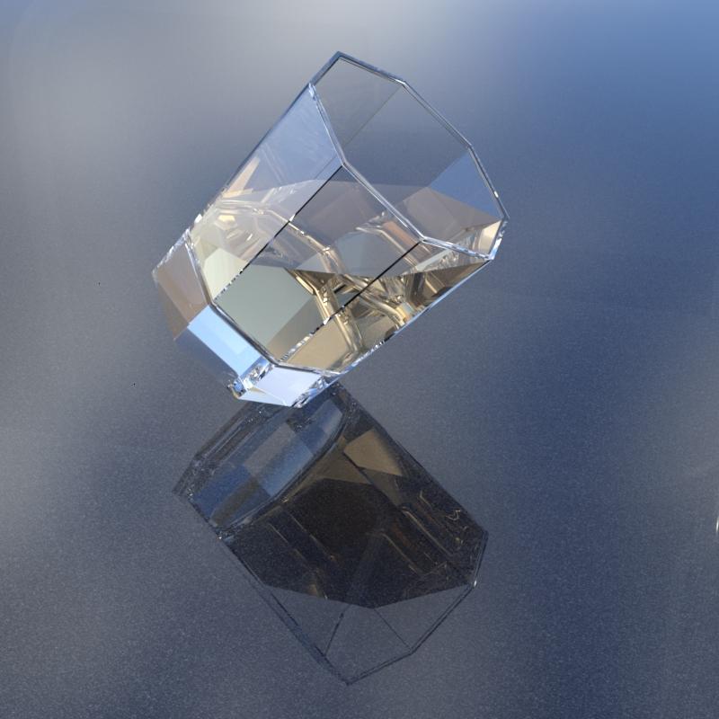 Please may I offer you another glass in this sporadic series. This one is an octagonal tumbler glass. Once again, the contents are separate from the glass and have two morphs - a tilt and level morph. Again the contents can rotate independently of the glass, to get the tilt at the right angle.