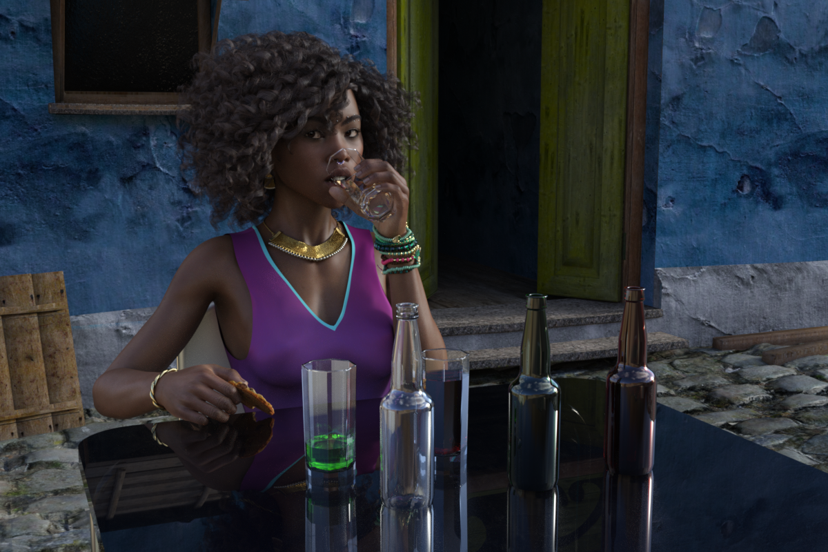 The glass and contents are totally invisible in Filament preview mode, and difficult to see in any preview mode except iRay, so I have included an opaque shader, to aide visibility, and a series of glass shaders to return the glass back to the colour you want. I have included four liquid colour shaders, Red & White Wine, Absinthe and 'Blue Lagoon' Cocktail.