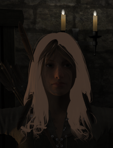 The brown hair is rendered indoors and I believe the only light sources are uber surface for candles and a fireplace.