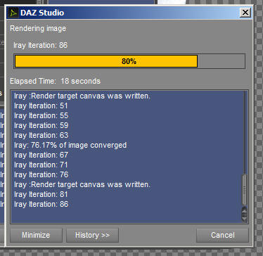 Eureka! Now I understand what everyone's been talking about all this time in the Iray render threads, because in all the years I've been using every single D|S version I've never used the History button on this dialog. Maybe DAZ should have explained this a bit more clearly. I'm fairly sure I've never seen a screengrab of this, everyone's just said "you see the render progress numbers".