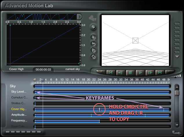 I have animated a simple cloud pattern in SkyLab in Bryce 7. What I would like to do is copy the keyframe from the beginning of the animation, and paste it at the end, so that the clouds return to their original positions. I see multiple references to clearing and setting keyframes, but almost nothing about copying them.