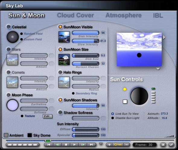 If you are creating a scene where clouds need to move over the duration of the action, use the Cloud Motion: Speed control and set a keyframe for it. You only need to set one keyframe for Cloud Motion: Speed at the beginning of your animation. Then the clouds just keep moving for the entire duration of your animation. This parameter is unique in all of Bryce, as it's the only parameter that uses ONE keyframe to generate motion or change. If you want to change to cloud height, or cloud density, frequency or ANY other setting, you require at least two keyframes.