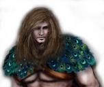 There are a couple of things that jump out at me: You've gone a more stylized route with his skin (almost a noir look on the face, although the chest area looks painted), hair, and the bands (more brushed/painted) across his chest, and then a more realistic look for the peacock feathers on the shoulders. Also, the skin is fairly desaturated (at least that's how it appears on my monitor) while the bands and the cape contain more intense colouring.
