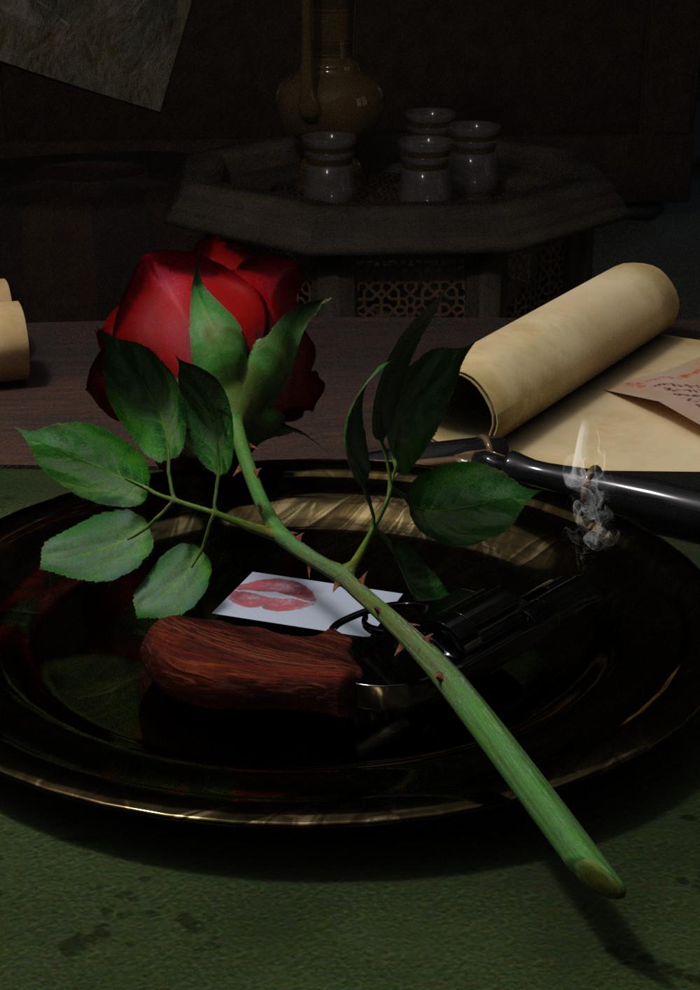 I was thinking cover for a murder mystery. If I manage to get something good, it will go up for sale so it would be for whatever the author wants to use it. I did want the gun to be prominant so I kind of missed the mark there. I didn't realise until I saw the thumbnail how much it blended into the background. I have that PS brush set. I'm not great with brushes yet, but I'll have to play with it to see if I can figure it out. I've changed some things around to hopefully make the gun more prominent; changed some angles, moved the lighting slightly and, since the rose is somewhat poseable, I placed it under the gun and decreased size of it some. I'm running a render now so I'll see how it looks once it is done. Thanks for the comments. They were very helpful.