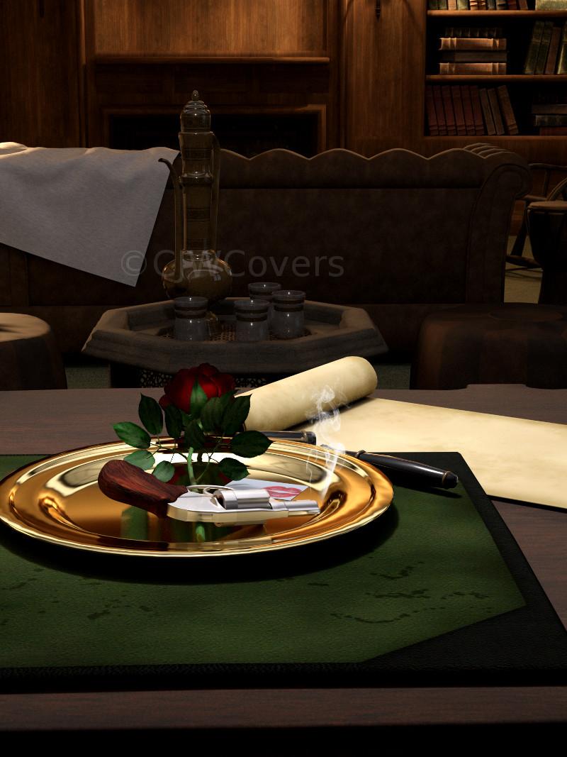 I've been working on this mystery cover. I've made some changes and I wanted to see what everyone thought of what I've done. I'm also rendering out an alternative camera angle with a couple of changes, but I think I like this version better than the one currently rendering. My thoughts are that if a print cover was requested then a full render with the rest of the room could be done with the part of the gold platter that is currently cut off could wrap around the spine of the book. Since this would be my first cover and I have no idea if it will even get a buyer once I've posted, I'm not sweating that detail at the moment. I'm not even sure how those print cover requests are even handled by the site I plan to upload the cover for sale.