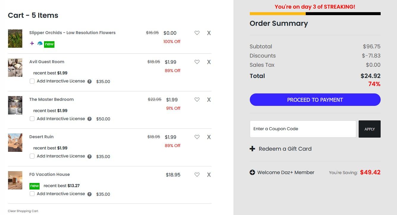 https://www.daz3d.com/checkout/cart ; is missing the new element that was displaying the 3% off * days