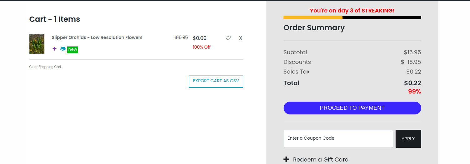 As shown on the picture, there are no 3% nor the 9% off for three days of streaking as a reduction for the FG Vacation House (which I don't really want to buy, but put into the cart to show that there isn't any price reduction for a product that obviously should get one)