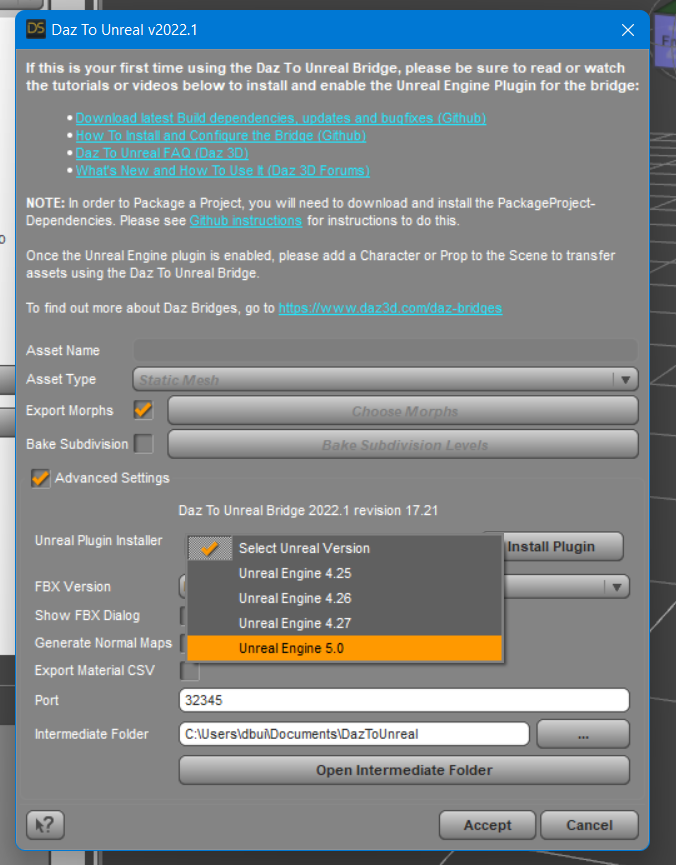 About version differences: The updated version numbers for both the Daz Studio Plugin and the Unreal Engine Plugin from Daz are now both 2022.1. The version number for the updated Daz Studio plugin can be found selecting File->Send To->Daz to Unreal and then opening the Advanced Settings box. The version number for the Unreal Plugin can be found by selecting Edit -> Plugins then selecting DazToUnreal. Both Daz Studio and Unreal Engine plugins have the changes from David Vodhanel's github updates up to July 6, 2022.