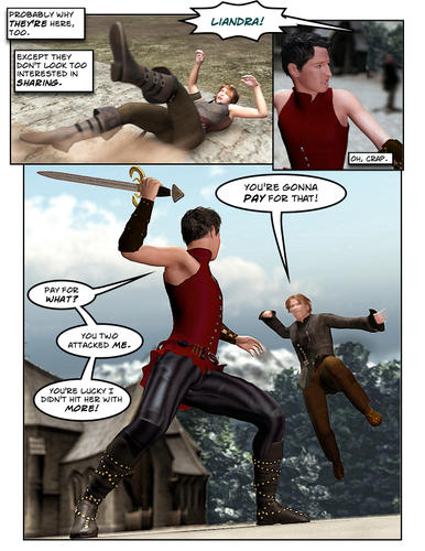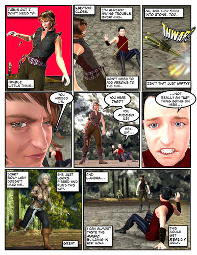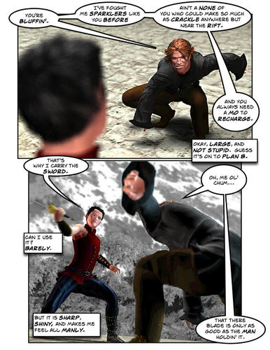 Hopped on the DAZ train during the incredible give-away deal. Started a comic project using DAZ, LightWave, ZBrush, Photoshop CS4. and Comic Life (yes, really) as my primary tools during the winter, but got distracted by the yellow sun and blue skies of summer. Now that fall is already bearing down on us, I decided to get the project rolling along again.