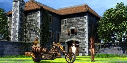 I used Old country farmhouse, Steampunkbike (for the transportation), Tamesis for Victoria 4 with a Summer casual fitte dress and Worldly Jones for Genesis 3. The tree (and an instance), grass and ivy, as well as the potted plants and some barrels came with the farmhouse. I retextured the farmhouse and the plants, as well as the groundplane to have Bryce textures. The stone textures of the house were mostly from RaRaja, whose stone (wall) textures I like a lot. Same for most parts of the bike. The textures for the people were made substantially smaller. Without these retexture activities, Bryce crashed often. The sky is one from Horo (with IBL). I added an additional light to give some light to the people's shadow parts.