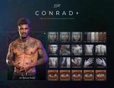 Within this bundle you will find Conrad's base character, the HD Add-On, and "Conrad Plus": an extra set of features such as facial hairs, stunning eyes, and multiple tattoo options. You'll also get the "Bon Vivant" pack, a sample of poses ready to illustrate this man's coolness, joyful and relaxed nature in any Genesis 8.1 male character.