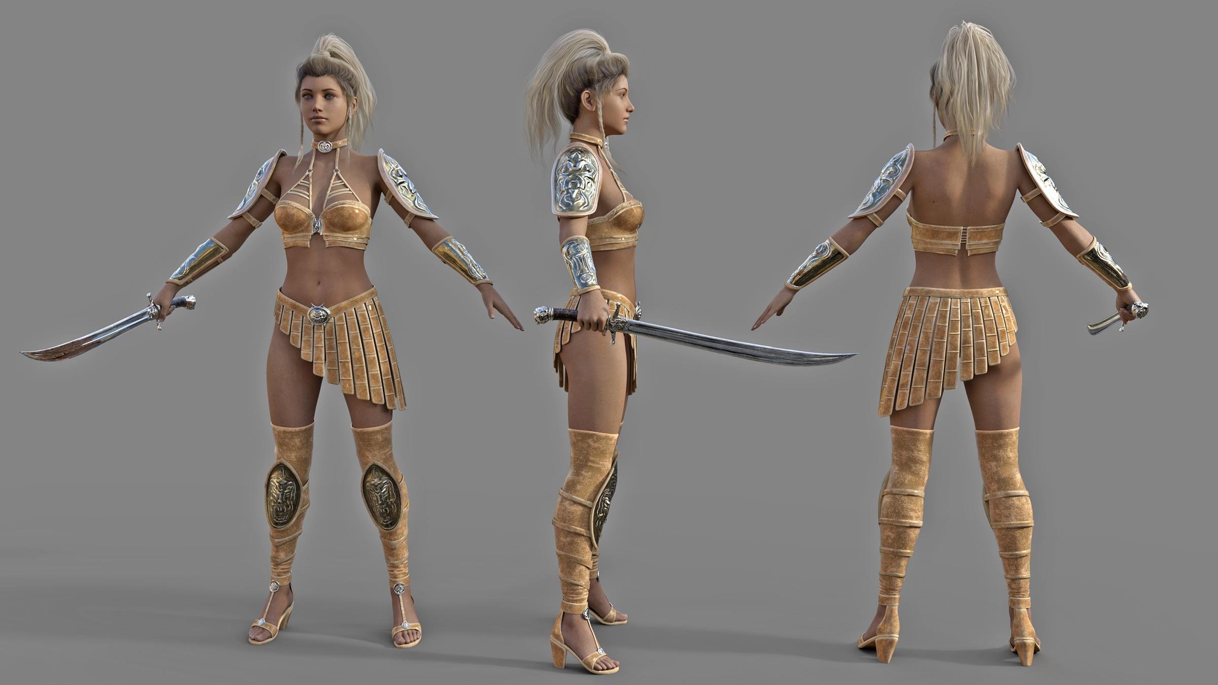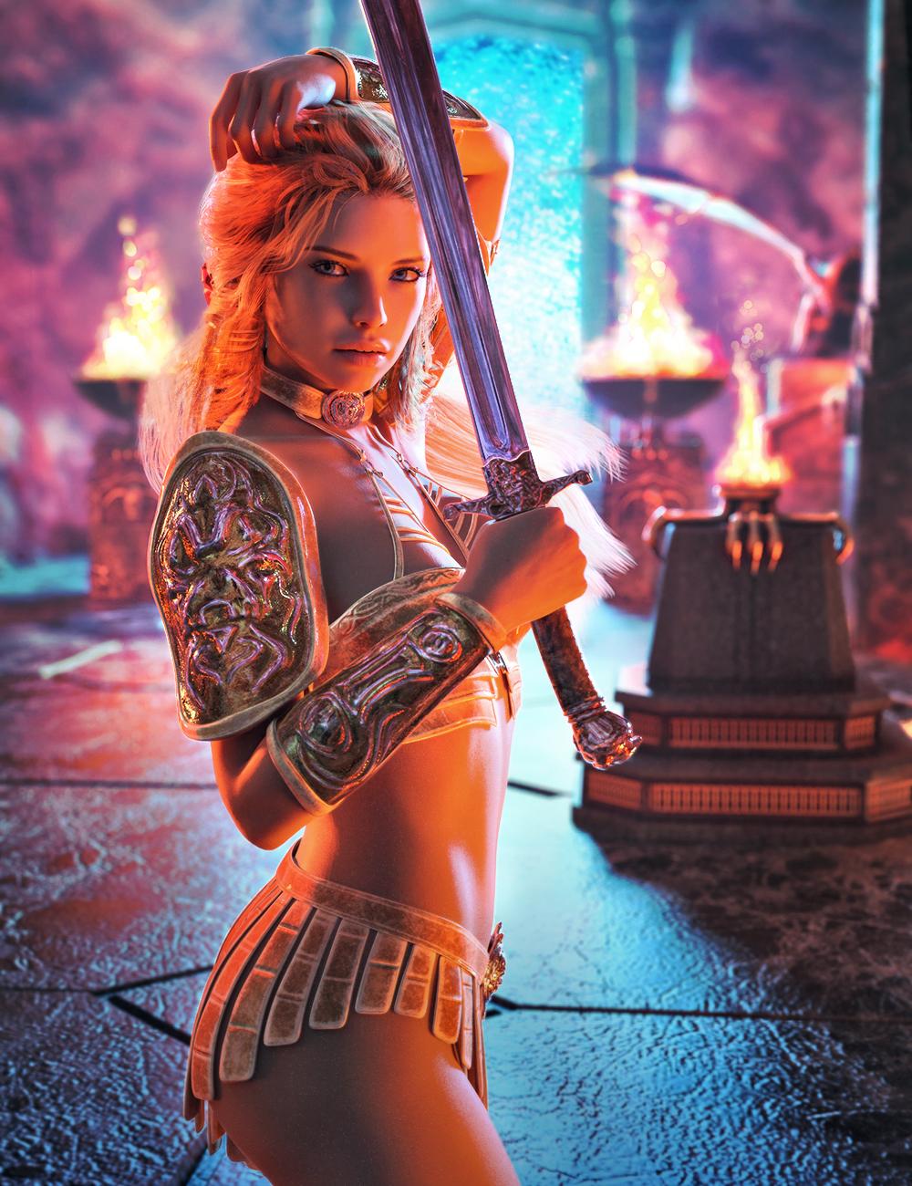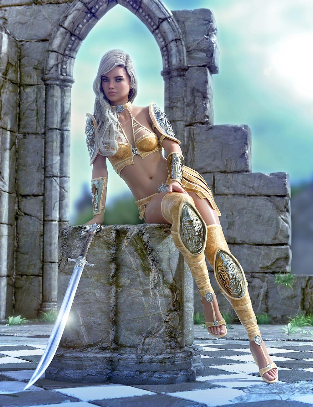 This warrior outfit is designed for Genesis 8 and Genesis 8.1 Females. It consists of some highly authentic historical armor elements (like pauldrons, greaves, and vambraces) with a hefty addition of fantasy and elegance.
