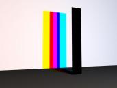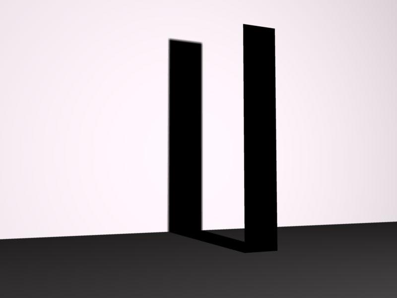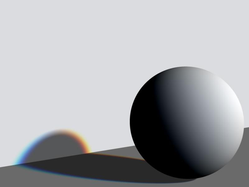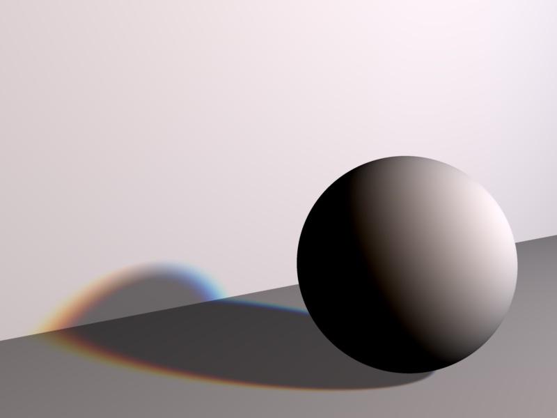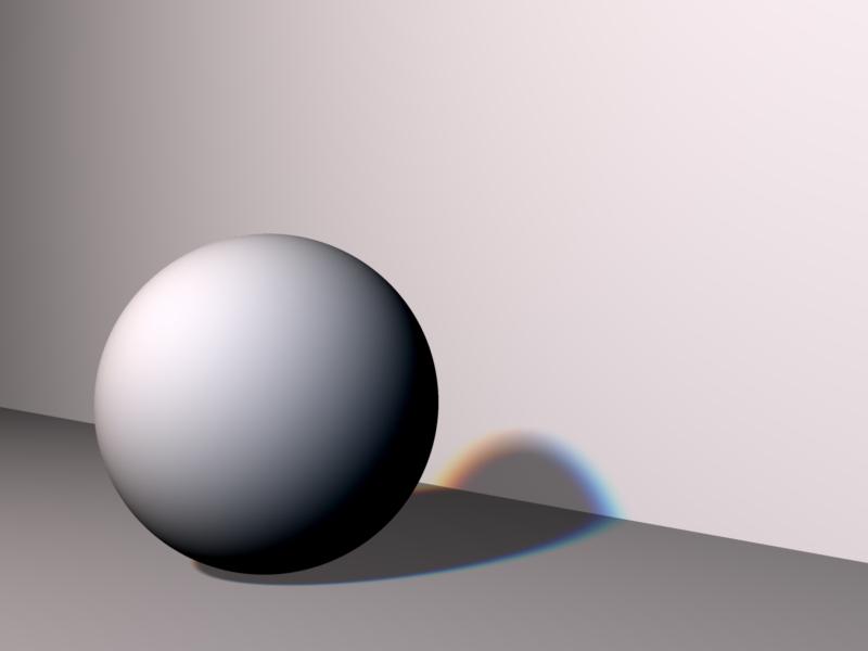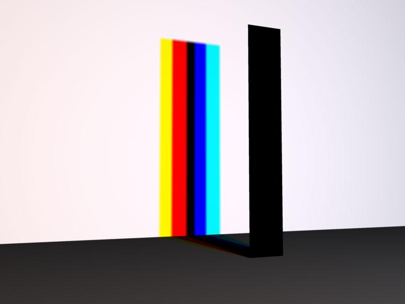 In the first render the shadow is as you would expect - the stick casts a black shadow. But if we start to separate the lights, the shadow starts to split into color components, and if we move them even further apart, we see those components completely separated.