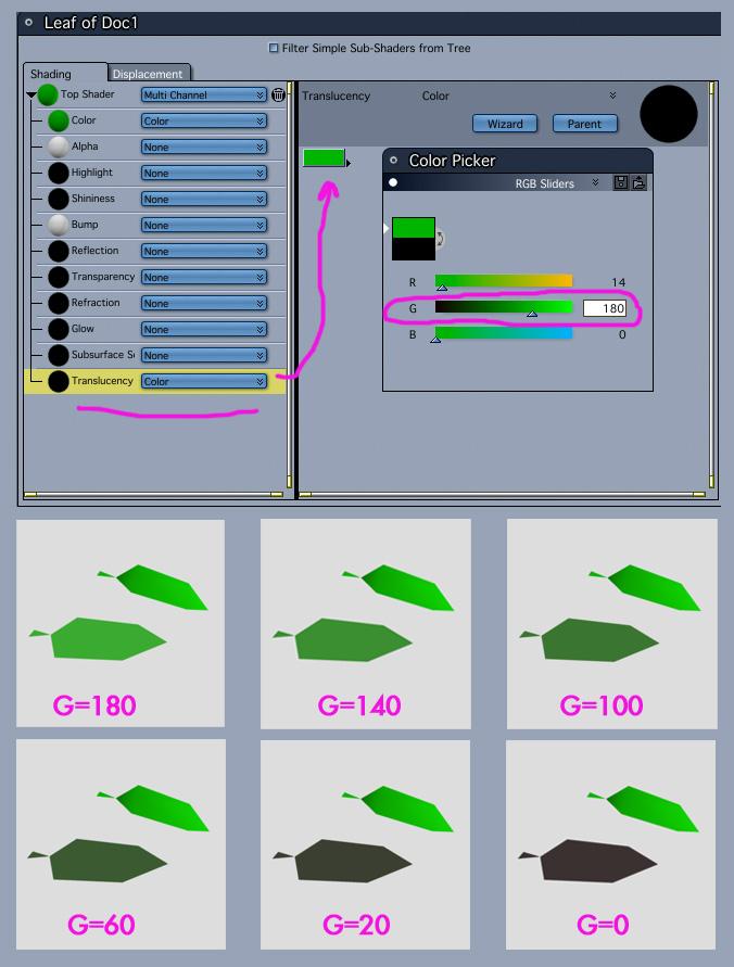In this example I plopped a gerenic Plant into an empty scene, converted to a Vertex Model and isolated a single leaf. I then made a new Shader and copied the Color of the generic plant leaf, then copied that into the Translucency Channel. The RGB values are R 14 G 180 B 0. I then made several renderings stepping down the values in the Green Channel. You can see the shadow is nearly black when set to zero, but a tiny bit warm due to the Red Channel value of 14. Using a straight Value slider will yield simple shades of gray.