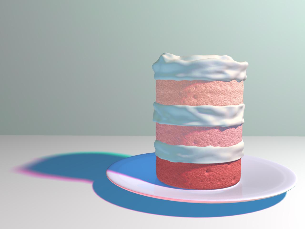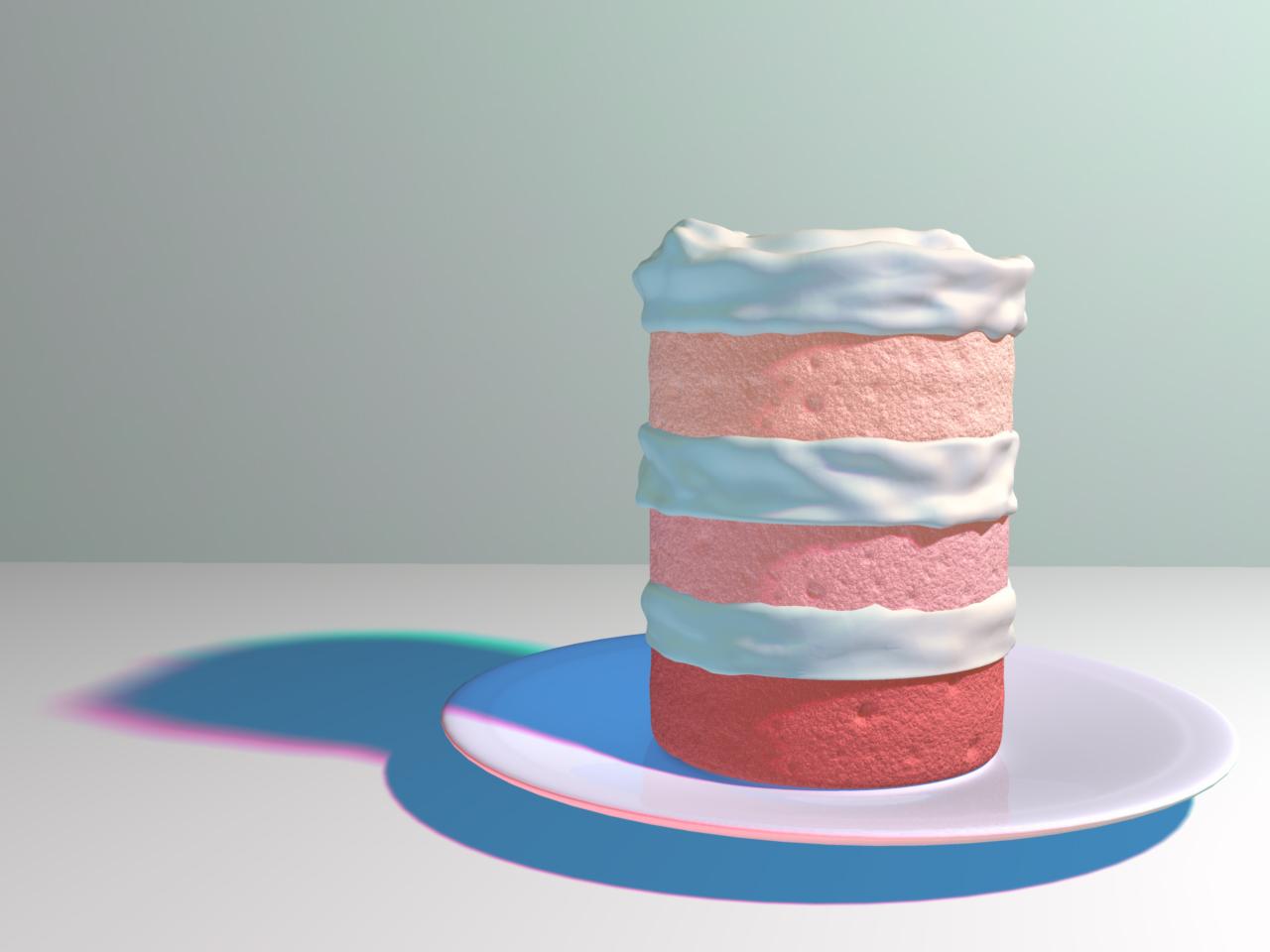 While I like the cast shadow color, I wanted the cast shadows of the cream casting on the cake parts to be a bit warmer. So I modified the scene so only the Cast Shadows falling on the cake would show up in the Shadow Pass using Multipass Rendering. I then used that as a matte in post to warm up those shadows only.