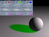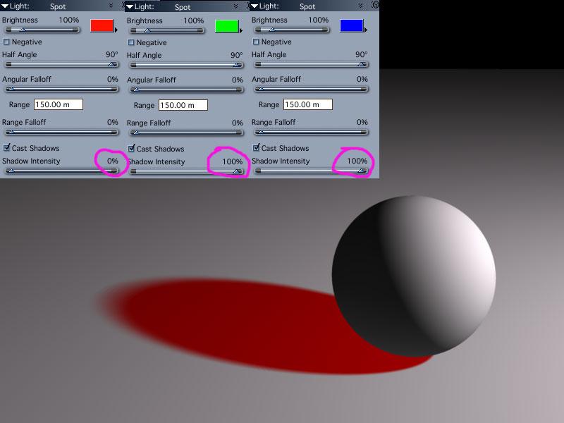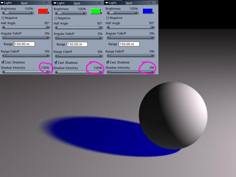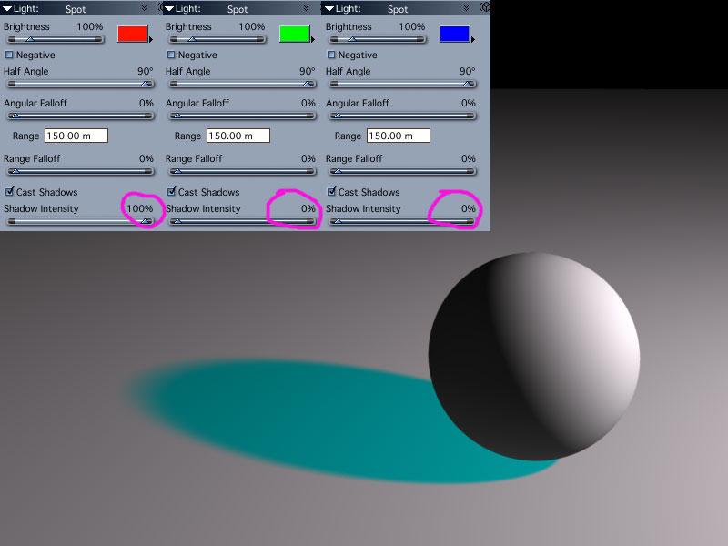 Not sure if that’s really what’s happening, but it seems to work. To keep the shadows more neutral in color, keep the values for each light’s Cast Shadows slider similar. The following examples are extremes, and of course look unnatural in the gray environment, so just for demonstration.