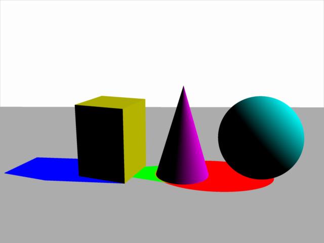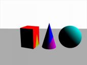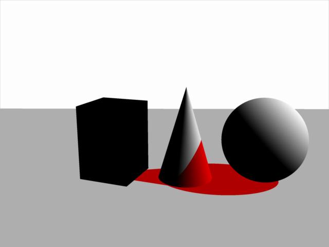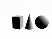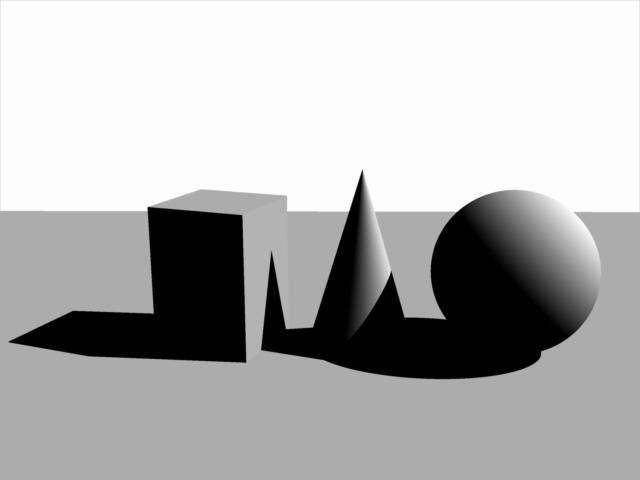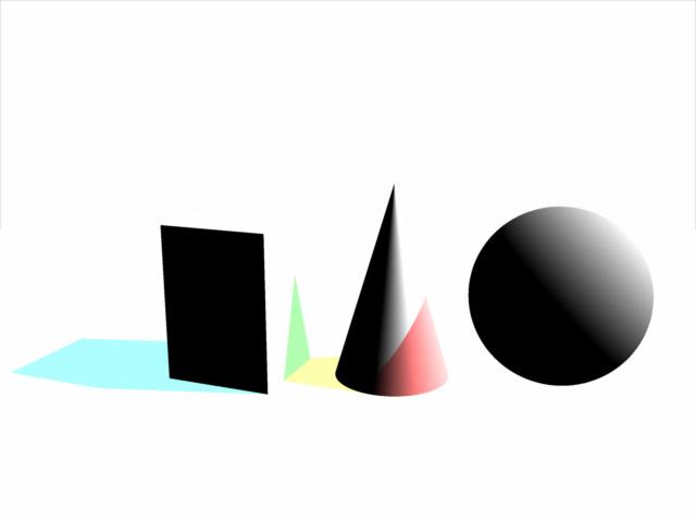 In this simple scene there are three basic shapes, a sphere, a cone and a cube. They cast shadows both on the floor and the sphere casts a shadow on the cone, and the cone casts a shadow on the cube. If you wanted to isolate those shadows, even with a Shadow Pass, it would be tedious to make proper selections.