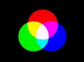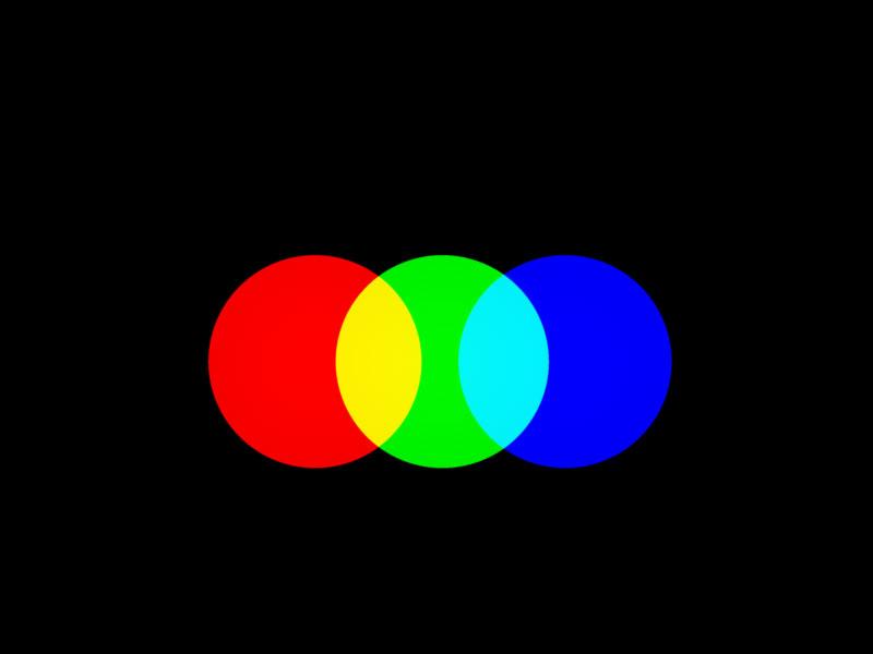 In this third image all three lights are overlapping to produce the three secondary colors Cyan, Magenta and Yellow, and ultimately, pure white where all three overlap.