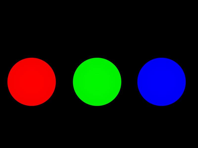 Here are three spots, one each set to pure Red (255,0,0) Green (0,255,0) and Blue (0,0,255). The Radius has been dialed back and they are aimed directly at a white plane - no other lights are in the scene. You can see in this first image the Spot Lights are separated.