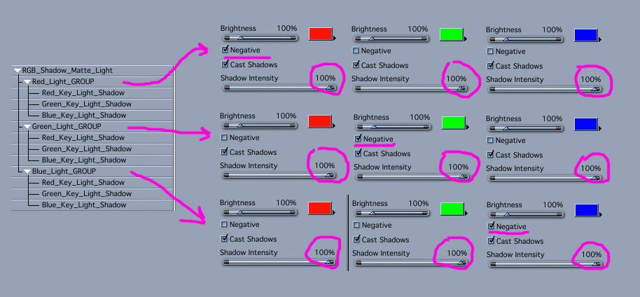 For the Red Shadow, click the ‘Negative’ box of the Red Light only and set all Shadow Density sliders to 100%