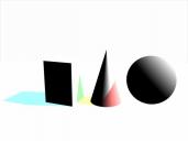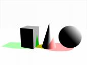 The following images demonstrate the successive blown out image. The first shows the sphere only - it has a light group set to cast a red shadow for the sphere, the floor plane and the cone. If we then dedicate a light group to shine on the cone to cast a green shadow, you already see the Shadow Pass looking unhelpful. Adding the last light group dedicated to the cube totally blows out the image.