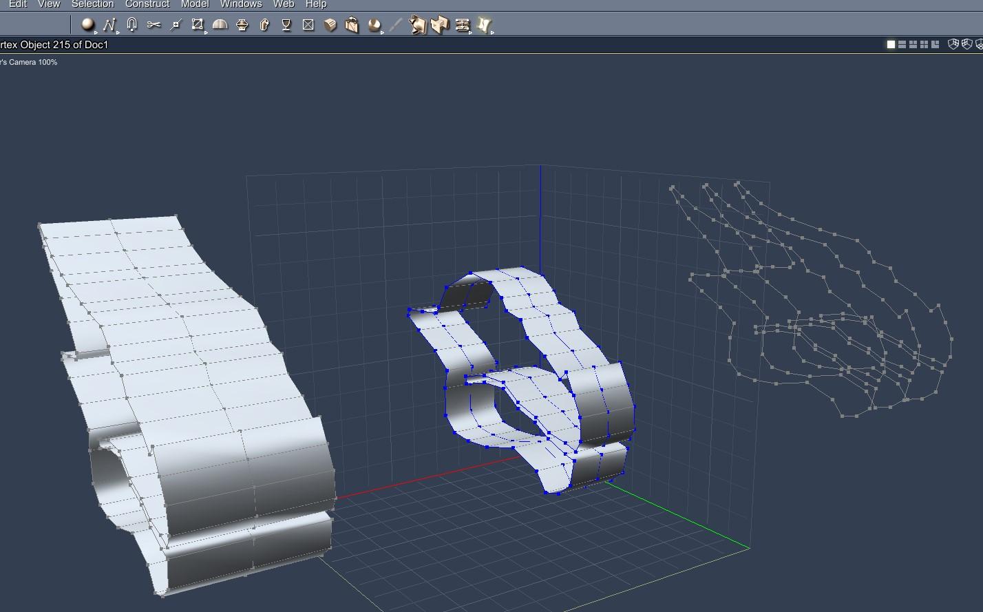 NOTE - I did not like having the one big horn so I repeated the process without the horns. See middle. This pic has the original polylines off to the right, the first try at creating the mesh in which I did not like the horns on the left, and then the revised head which I kept in the middle.