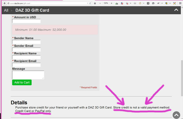 That's it. You have to buy a gift card with real dollars, because gift cards become store credit in your account, so during those times when there is a discount applied to purchasing gift cards, DAZ could actually start losing money in a loop of unscrupulous purchases if that safegaurd was not in place.