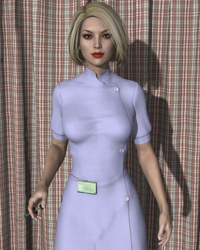 Rendered in 3Delight with V7 textures using omUberSurface. The hair is Hr-96 for V4 (by Ali) with textures by Wolfie. The uniform is Tentman's "Cure You Nurse Outfit" for G2F. I also used Actual Eyes 4 (MindVision G.D.S.).