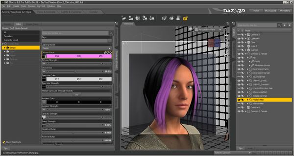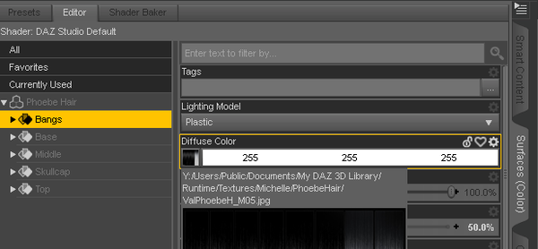 You're referring to the Channelah, I thought "Channel" was the entire block of stuff. Here I changed the color in the Diffuse channel to a nice pink of sorts on the Phoebe hair, By changing the Backing color to pink.
