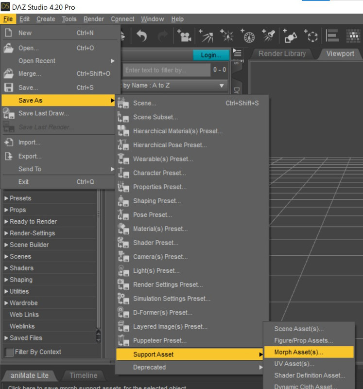 As shown in the image above, I want a keyboard shortcut for the chain of actions: "File - Save As - Support Asset - Morph Asset"