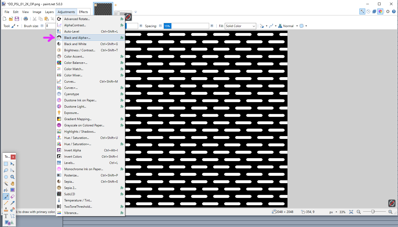 Step B - Staying in the Adjustments Tab, click on Black and Alpha+