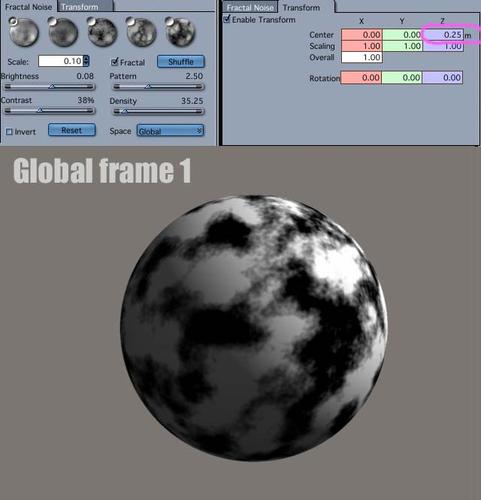This may just be the way Carrara behaves, and may be the norm, I don't know. It occurs in all the Noise Functions set to Global space and using the Transform Tab. I just tested in LightWave animating a sphere with a noise texture set to World space and successfully animated the texture position as well. I can't seem to confirm if this is a bug or normal behavior for Carrara.