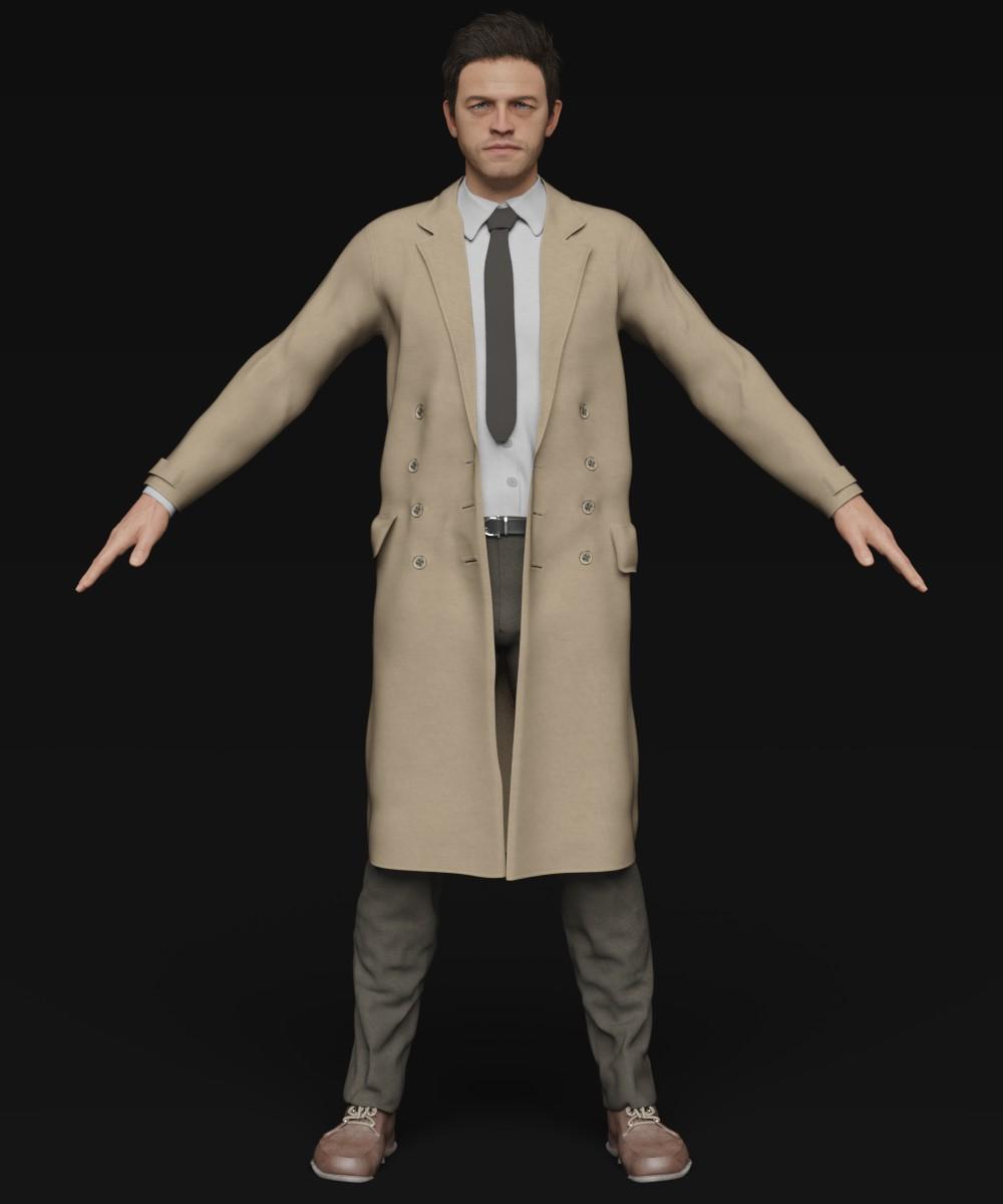 Clothing creation is outside my skillset so you're unlikely to see anything on that front from me unfortunately. But I did find that while it isn't a perfect match I picked up this outfit which is a reasonable approximation: https://www.daz3d.com/dforce-trench-coat-outfit-for-genesis-8-males