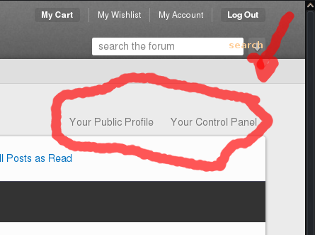In the upper right corner of the forum page...below the My Cart, etc...