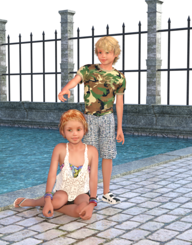 The girl's wearing the G3F Casual Summer clothes, and the boy is wearing a G2M outfit (Parkour Wear), both with alternate shaders.