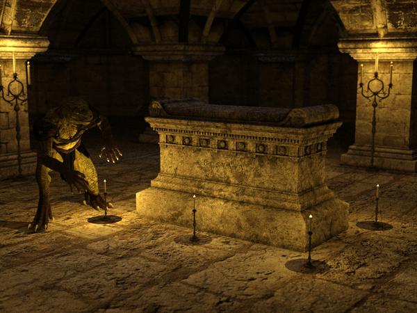 This is my first attempt with Iray; CPU renders only as I don't have the right GPU; each took around 2 hours everything default except the Tone Mapping settings. The camera was set for DoF across the Lizard Man and the coffin. The F/Stop is different between the camera and the Iray Tone Mapping setting but the DoF seems to be in the right place. Lighting was supplied by the light set that came with The Crypt consisting of point lights for the candles and UberEnvironment 2 with the candle nearest the lizard having the light increased a little so that it shone on his body.