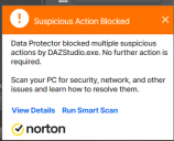 I've attempted to whitelist Daz Studio Pro Public Build from Norton, but nothing has changed. To give anyone reading this an example of what's going on, I'm trying to save the scene in the first screenshot I've uploaded below. The second screenshot is that of Norton's Security History on my computer. It says "Data Protector has blocked a suspicious action by DazStudio.exe". I've gone to the settings of Norton, the third screenshot, and I've opened "Items to Exclude from Auto-Protect, Script Control, Behavioral Protection and Download Intelligence Protection". The fourth screenshot shows where I've added the Daz Pro Public Build folder. But as I said, this doesn't solve the problem. Also, I've uploaded a screenshot of what this file looks like now in my Scenes folder, if this is helpful. There's an extra file on the side. What could I be doing wrong?
