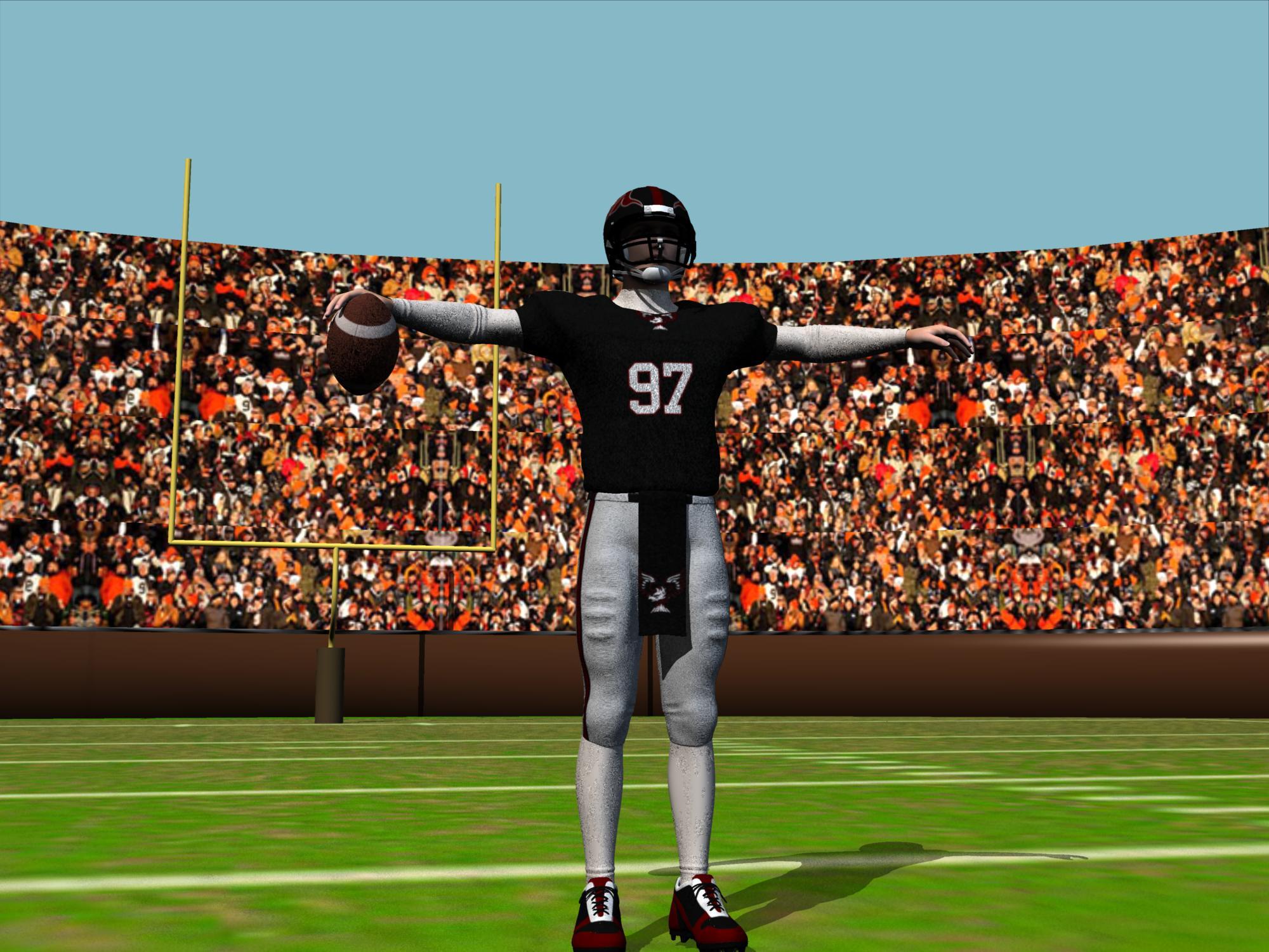 So here is a test render of field level Genesis 1 base male in the Genesis Football Uniform inside my stadium model.  I think with a little depth of field the stadium crowd would be accceptable even without replicating some torsos on the ledges.  Thoughts?  Just thinking about the stadium, have not made any adjustments to the genesis shaders.
