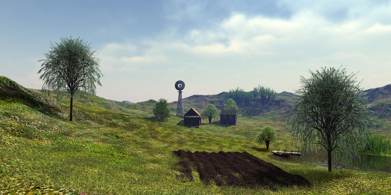 There are three terrains, a lot of weeds instanced on the highest terrain, parts of a castle from Alan Armstrong.