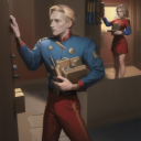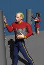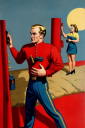 I prompted for doing in comic style of the Flash Gordon creator.  I would have to touch this up.  For example, you can see from my base render (attached) that the colors of the uniform are reversed.  Here is the verbal prompt for the man in the foreground.  (1 boy) man blonde hair in foreground wearing uniform (red shirt, gold trim, blue pants) standing, pressing right hand against pillar, holding box of tools with left hand.