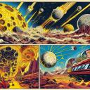 Using a different model makes a huge difference.  Here is the result of using the same verbal prompts and the same input images but using a different model.  The result for the figures is much closer to the 1940s style, but the sets and props are not as good.  And where did that moon come from?