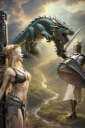 Great work, Artini.  Daz Studio can probably render anything, but needs Blender or ZBrush or.... to do the sculpting or modeling.  I did some more playing around.  Here is yet another interpretation of the myth of George vs the Dragon, perhaps suitable for cover art.  I started with decades old Poser figures in Carrara, and rendered a depth pass.  Poser 7 Sydney and Simon.  Maybe 10 - 15 minutes to throw together the Carrara scene, including customzing with the built in terrain modeler and plant modeler.  I used the depth pass in Controlnet to help direct the way in which Stable Diffusion manipulated the image.  I will attach the original Carrara render and its Carrara depth pass in addition to the Stable Diffusion output.  Pretty sure Daz Studio could do the same as Carrara's depth pass.  Canvasses I think is the term.