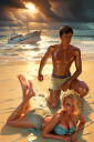 One more example of a final image and the 3D renders used.  This is an attempt at a vintage pulp cover was made using 'text2image,' not 'image2image.'  The 3D renders were used in Controlnet (a) 'canny' to detect outlines (the toon filtered render) and (b) depth (inverted the depth canvas/multipass).  It can be problematic to rely on text prompts to direct the composition of multiple people.  In this case, I did not use the main render (beauty canvas) for anything so I am not including it.