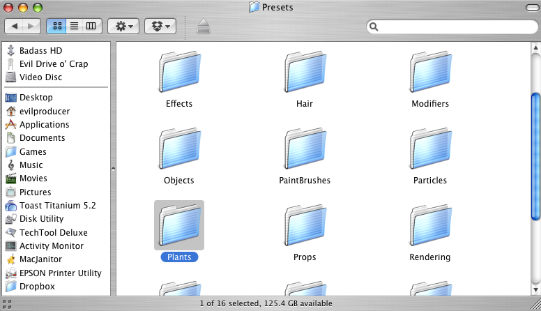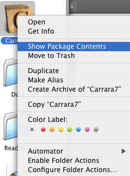 If I recall, you need to go to the Carrara application icon, control or right click the icon, when the contextual menu comes up, choose Show package contents. A new window should open with a folder called Contents, open it and then open MacOS, then open the presets folder, then the Plants folder and place your files in one of the folders. I think Howie's scene created the Misc. folder, so I just placed that in there along side the Basic folder, but I could be wrong and the Misc. folder could have been there and I just dropped the files in that. I'll post some screen shots.
