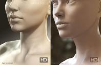 It appears the entire skin surface is sculpted with pores and other bits of microgeometry. The G2 HD morphs seem to only have extra detail in feature areas. Lighting a character modeled with high frequency microgeometry will look much different than a character with a flat skin surface, especially concerning specular reflections.